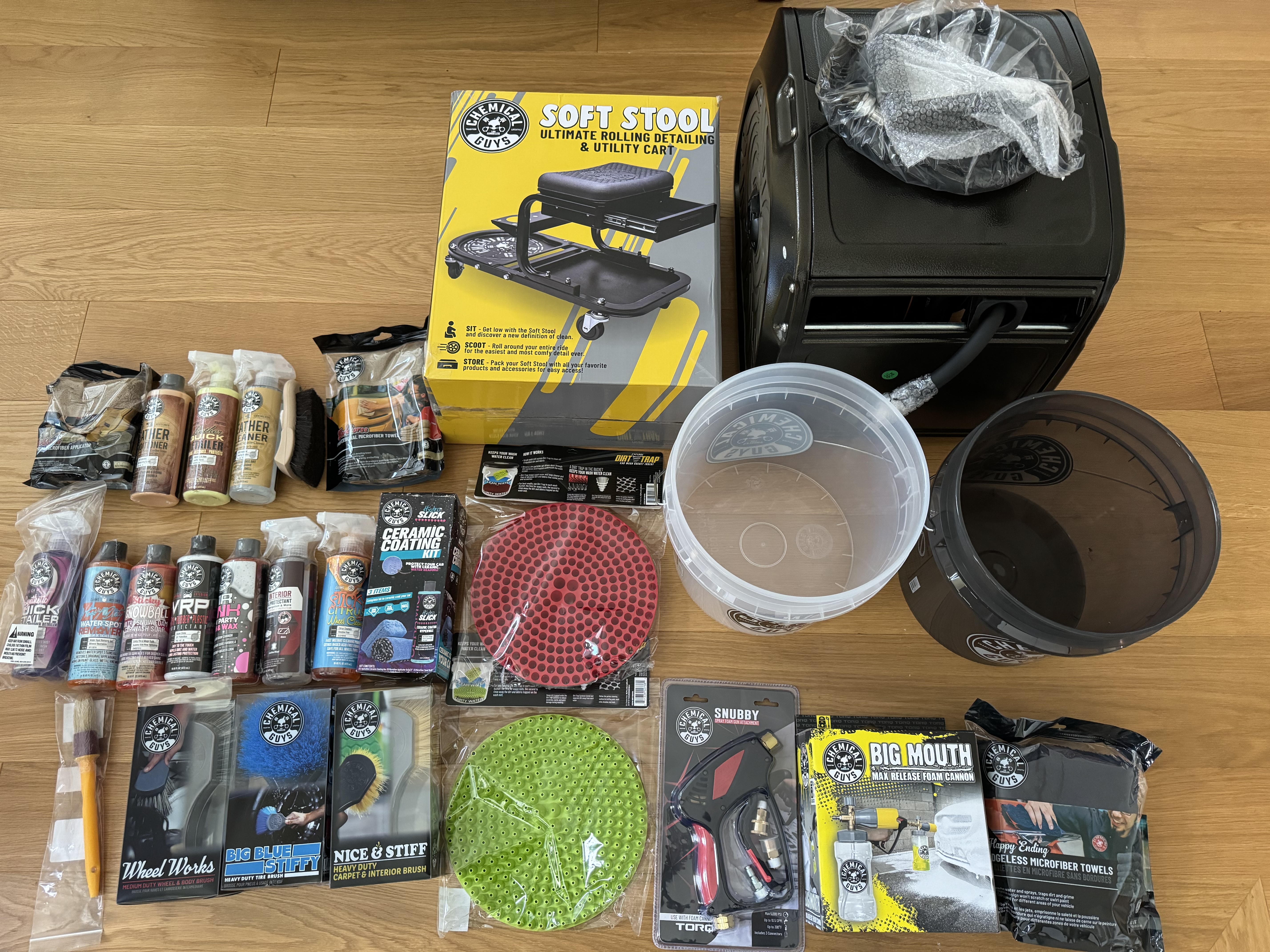 그러다가 가라지 안에서 세차를 할 수 있지 않을까 해서 방법을 찾다가, 바닥에 차보다 조금 더 큰 비닐 보호대를 깔고, 보호대 주변에 3센치 정도의 물 댐 역할을 하는.. 뭐라 단어가 생각 안나지만, 암튼 물이 안에 고이면, 고인물을 펌프로 빼내면 되지 않을까라는 생각으로 시작해서 우선 세차 장비부터 마구 질러댔다.